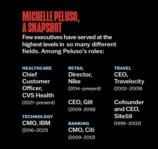 Roughly a year later, Peluso is still studying alongside her kids. After spending the last five years at IBM, the 49-year-old mother of two was named the first-ever chief customer officer of CVS Health in January. Since then, she’s been immersing herself in the intricacies of the healthcare system and reimagining how to deliver COVID-19 tests, vaccines, and healthcare more broadly to the company’s customers. It’s no accident that Peluso’s hiring coincided with President Biden’s rollout of a new vaccine plan that aimed to enlist pharmacies like CVS Health to administer 100 million vaccination shots over his first 100 days in office. “It’s a huge challenge, and the CVS Health team has rallied to create a seamless experience for customers that meets the moment,” says Peluso.
