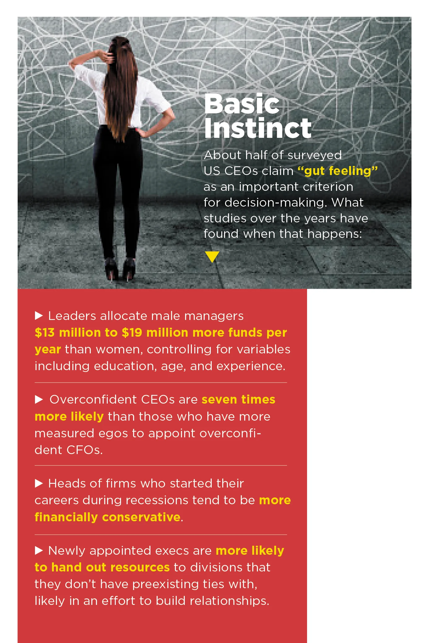 So how can leaders use this understanding to make more sound decisions? Self-awareness is an obvious but overlooked starting point. That can be achieved through personality assessments or other tests that help leaders understand their wiring, including their personal proclivities. From there, they can build teams that have a counteracting effect. A risk-taking CEO can mitigate impulsive investments by working with a more cautious CFO, for example. But given that executives overindex on confidence—a trait that can make it hard to self-administer external limits—Guenzel recommends more radical measures, such as moving authority from a single leader to a group. Involving multiple people, including an outside observer who is detached from internal emotions and politics, forces the company to validate assumptions that would otherwise go unchallenged, he says.