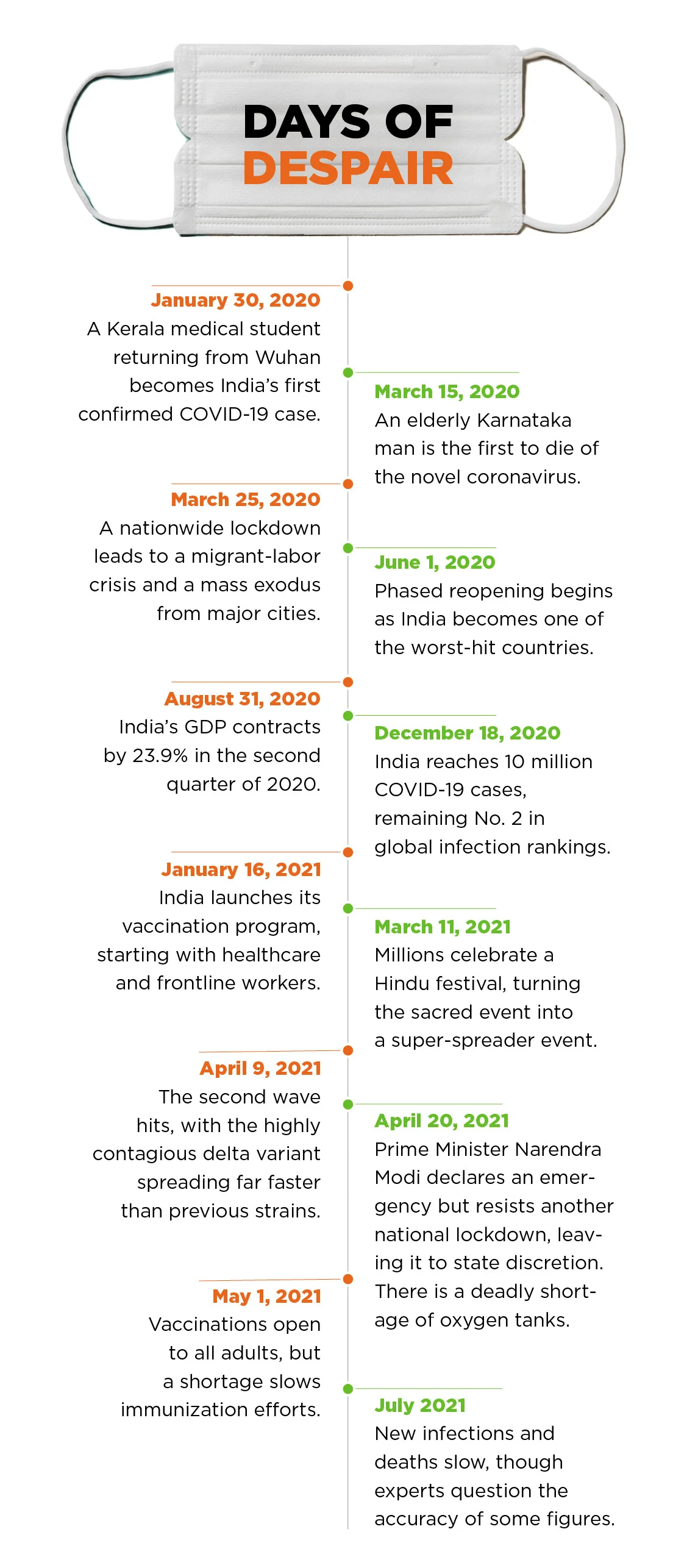 Across the globe, COVID has been an unexpected and devastating blow, leaving country after country struggling to keep the populace safe while propping up some semblance of an economy. But perhaps nowhere has the scale of that combined assault been greater than in India, a nation with 1.3 billion people and the world’s sixth largest economy. It is here that the delta variant—which now plagues the rest of the world—struck first and hardest. At one point last spring, the country was recording roughly 400,000 cases per day and contributing half of the world’s total infections. (By the end of the summer, there were fewer than 40,000 daily cases.) Overflowing hospitals had no choice but to turn away sick patients, international media outlets shared footage of mass cremation sites, and desperate citizens appealed to Twitter for help finding oxygen tanks. By some estimates, India lost as many as 4 million people to the pandemic.