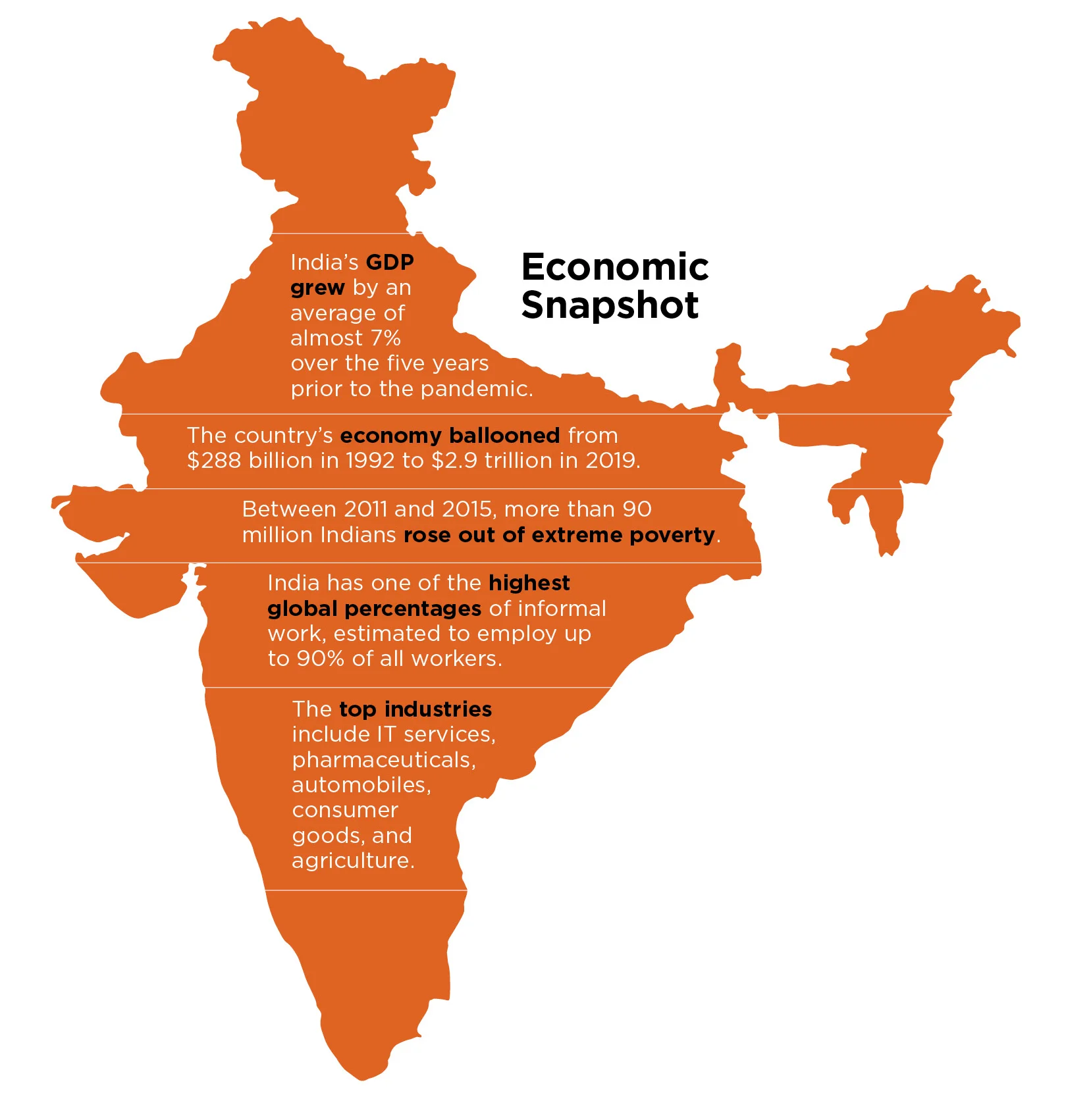 The coronavirus outbreak has clouded some of this rosy economic forecasting. In March 2020, Prime Minister Narendra Modi ordered one of the world’s swiftest and largest lockdowns in an effort to minimize contagion during the first wave, but it sent businesses reeling. The nation experienced its first recession in nearly 25 years; GDP contracted by 7 percent as approximately 200 million people saw their incomes drop to below the recommended need-based minimum wage of $5 per day.
