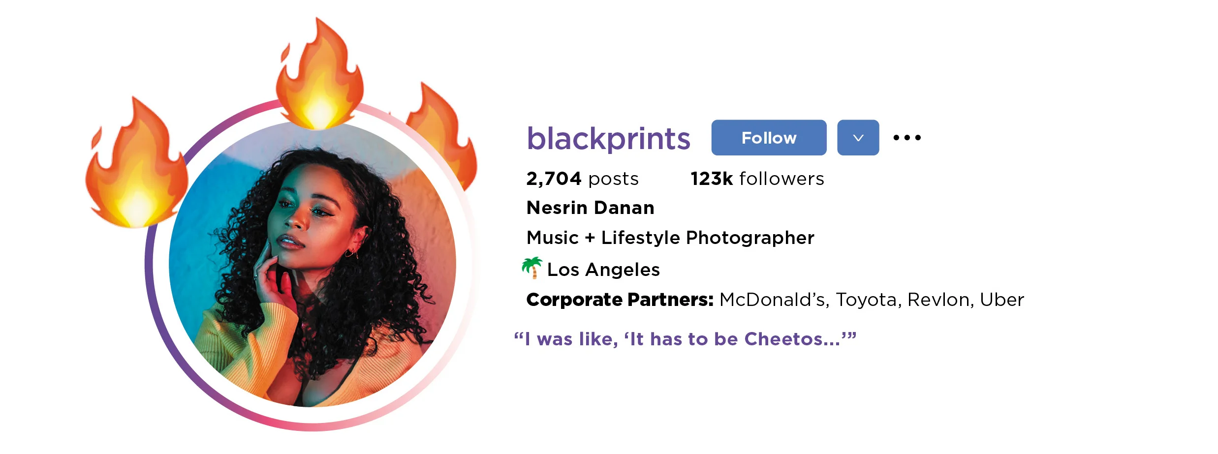 In fact, last year, Popular Pays presented an opportunity to do a TV ad with Frito-Lay. With the pandemic lockdowns, they couldn’t produce ads with a crew, so they sought visually skilled influencers to film themselves casually eating snacks—oh, and they needed it turned around in a few days. In the name of authenticity, she got to pick her snack of choice. “I was like, ‘It has to be Cheetos,’ because that is my favorite food,” Danan says. She and a fellow photographer walked around her Los Angeles neighborhood with a bag of Cheetos. “It probably took two hours total to film and do all the editing,” she says. They sent the material off, and shortly after, Frito-Lay aired a TV ad featuring a brief clip of Danan munching on cheese puffs.
