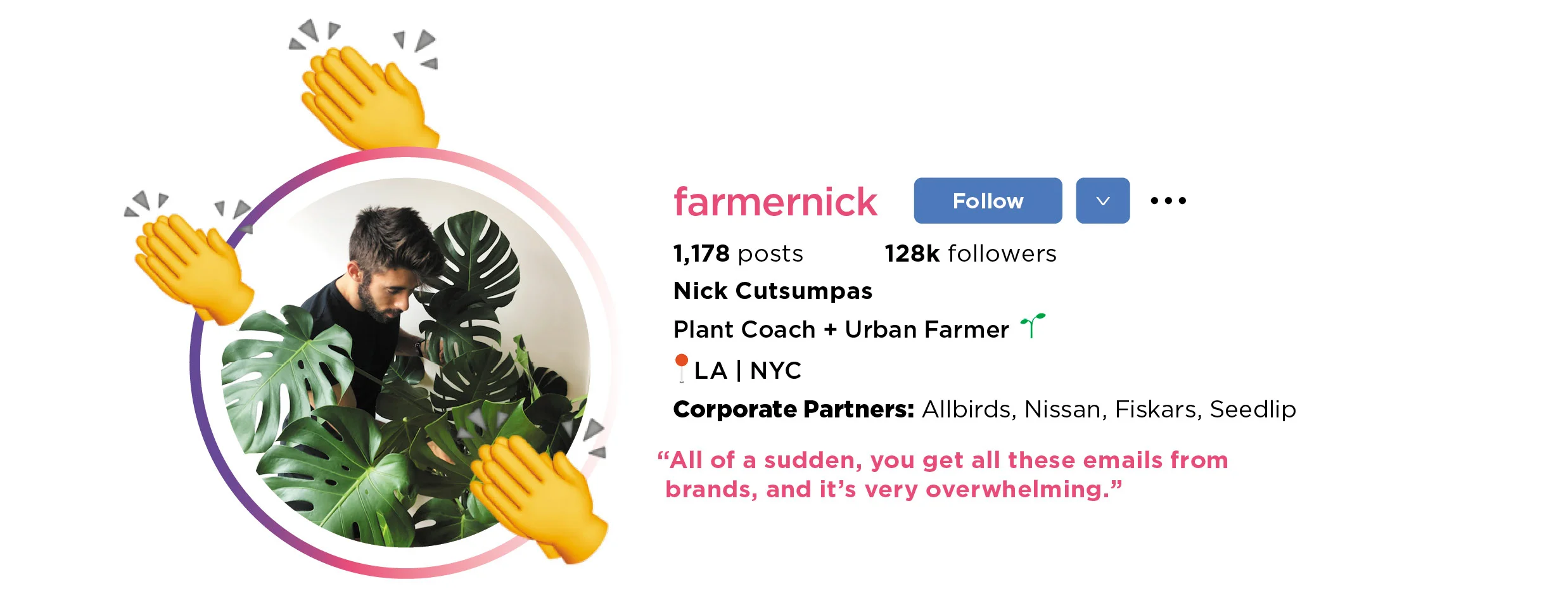 It started when Cutsumpas moved to New York City after college and began avidly collecting houseplants. He had only posted on Instagram socially, but his then-girlfriend suggested he devote his feed to imparting urban horticultural skills. “It really took off from there,” the 29-year-old says. By mid-2020, he’d built a following of around 30,000. Then he was invited to be a contestant on the Netflix reality show The Big Flower Fight, where foliage aficionados go head-to-head constructing enormous floral sculptures. “It was very much out of my wheelhouse,” Cutsumpas says. Sure enough, he was eliminated in the third episode, but that didn’t matter to his growing Insta audience—or eager sponsors. “All of a sudden, you get all these emails from brands, and it’s very overwhelming, especially when growth happens fast,” he says.
