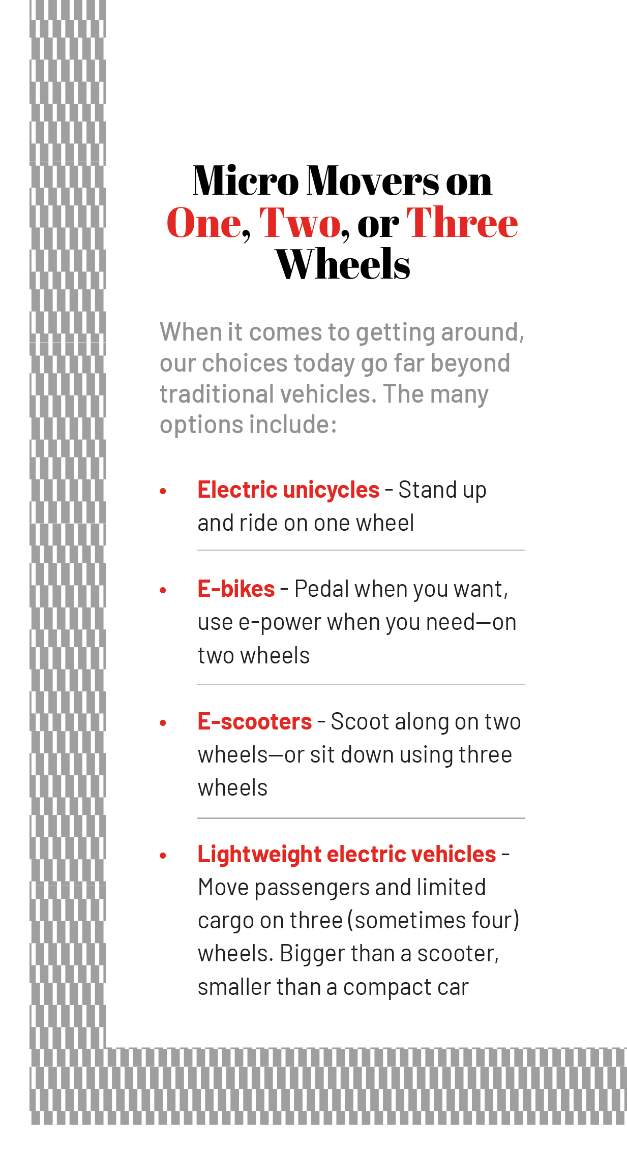 But this new technology faces a number of obstacles, including concerns about sharing roads with cars and pathways with pedestrians—not to mention the fact that micromobility is nothing less than a culture shift. “It’s a challenge, especially in a very car-centric society,” adds Circella. In all, it adds up to a bumpy road to acceptance.