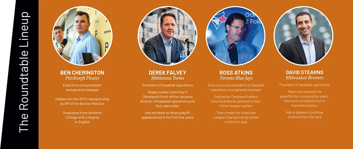 Cherington (Pirates): I think to some extent baseball operations departments have become small tech companies. What data do you want to pursue? How do you take advantage of it? You need people with the skills to make those choices and to convert the data into something that a human being can use to make decisions—whether that’s a player, a scout, a coach, or someone in the front office.