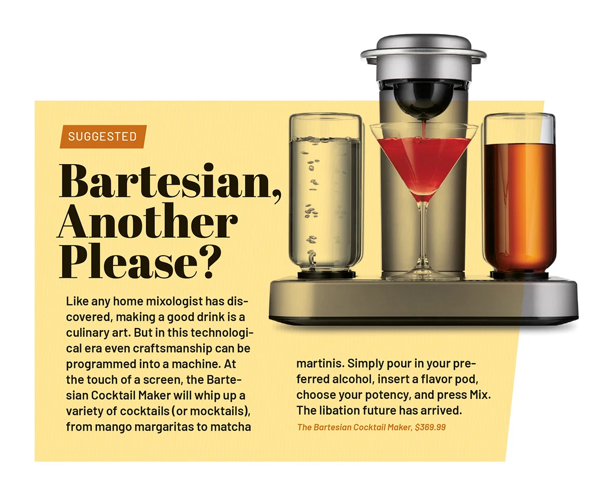 In this technological era even craftsmanship can be programmed into a machine. At the touch of a screen, the Bartesian Cocktail Maker will whip up a variety of cocktails (or mocktails), from mango margaritas to matcha martinis. Simply pour in your preferred alcohol, insert a flavor pod, choose your potency, and press Mix. The libation future has arrived.