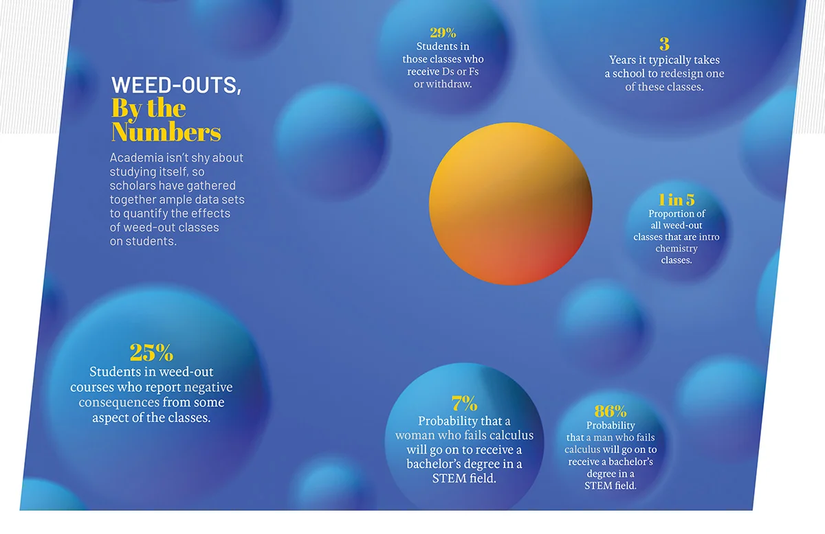 Proponents say that this is how the educational world operates, relying on various benchmarks to move the right students forward. But critics say the system weeds out so-called late bloomers and too many other promising students, especially low-income students and students of color who come from underresourced school systems. Weed-outs also tend to amplify problematic gender ratios. “We have admitted these students willingly to our institutions,” says Drew Koch, CEO of the John N. Gardner Institute, an organization that improves collegiate teaching and learning and also tracks weed-outs. “The idea that we now need to weed out students to somehow maintain standards and rigor is really no longer relevant, equitable, nor fair.”