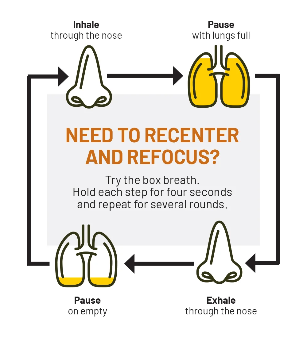 These days, when Clarke feels her shoulders climbing upward, she pulls them back down with an extra long exhale. If she’s distracted and needs to refocus, she’ll do two minutes of sama vritti pranayama, better popularized by Navy Seals as box breathing. And always before hitting send on an email, she takes a big belly breath.