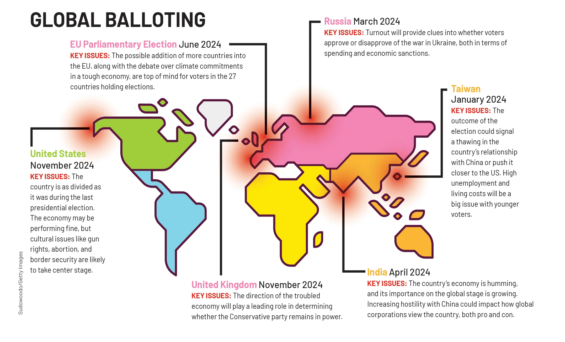 But it hardly stops in the US. Across the world, countries representing more than 50 percent of global GDP are holding elections, the outcomes of which could hold significant ramifications across many industries. Take India, for instance, where Prime Minister Modi is running for a third consecutive term. During his tenure, he has pursued policies to position India as a manufacturing alternative to China for international companies, particularly in the technology and clean-energy sectors. The fact that India has grown into a viable option for US companies seeking to mitigate supply-chain disruption has further exacerbated tensions with China. “The relationship between India and China has not only soured, but also become increasingly hostile,” says Navnit Singh, chairman and regional managing director in India for College Pro, noting that China skipped the G20 Summit in India.
