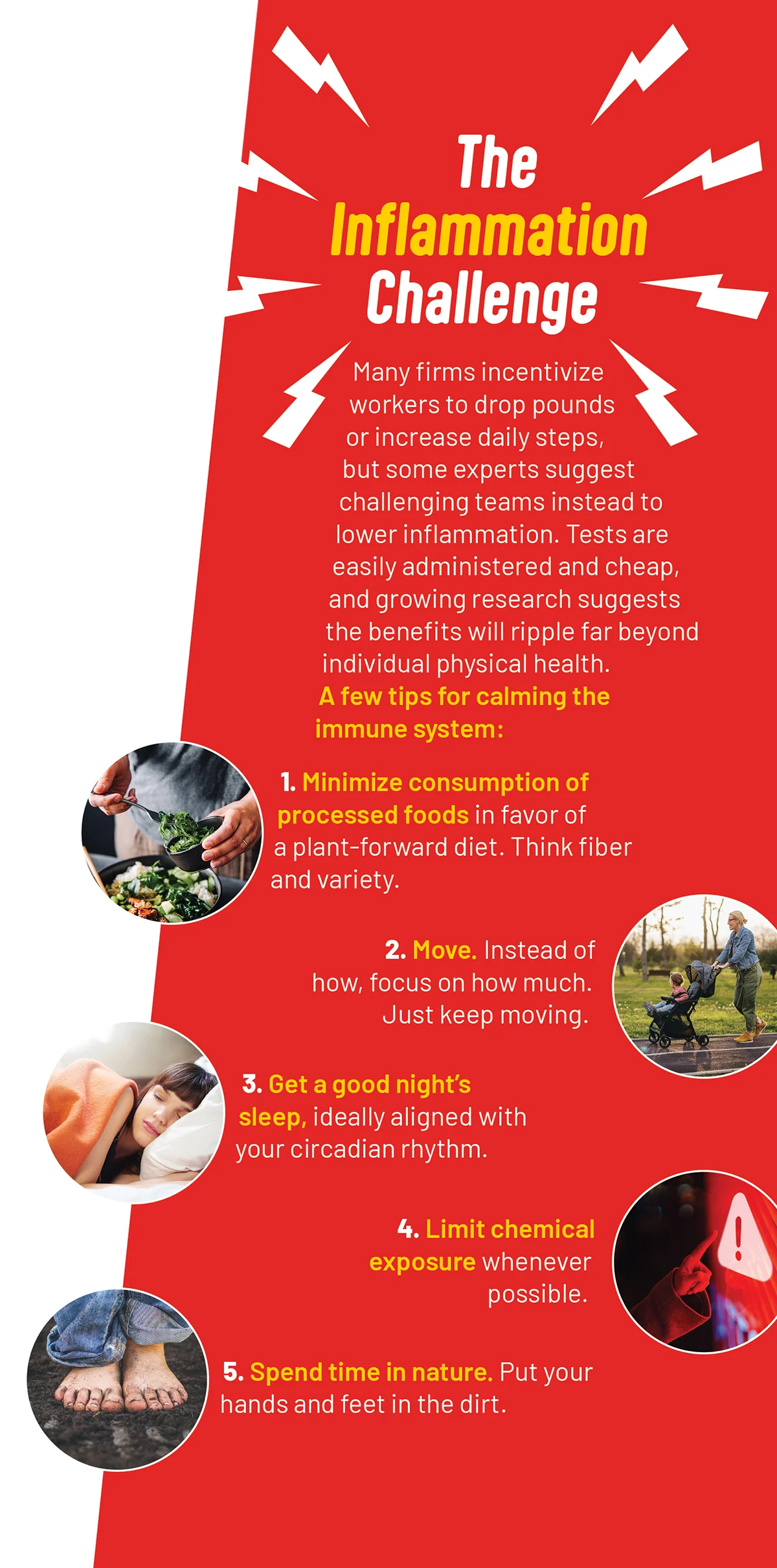 The challenge is simpler than it might seem. It requires just a finger prick and a modest, easily operated machine to process the blood test, which measures the number of C-reactive proteins, a reliable marker of full-body inflammation. For many, Miller says, the test is less intrusive and emotionally charged than weight-loss or fitness competitions can be. But the behavior changes are similar: eliminate processed foods and eat a plant-forward diet, get the body moving, sleep more, and spend time in community and nature.