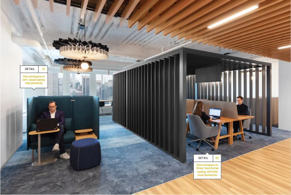 To be sure, this type of transformation doesn’t come cheap: US companies poured $44 billion into office renovations last year. And the research that goes into the changes is eye-popping. Rather than simply designing and implementing their plans, for example, many designers will construct temporary 90-day pilot spaces and use them to study employees’ comings and goings (which can vary widely from team to team and company to company—especially in offices housing 40 or 50 different job functions). Janus monitors these provisional spaces with sensor tools, surveys the employees, and adjusts her plans every 30 days. “We tweak a lot,” she says.
