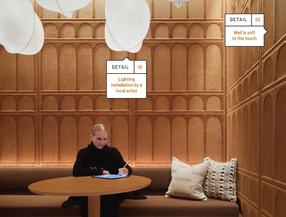 The finishes in the room radiate a sense of safety and quiet that’s particularly appreciated by employees who crave silence. “We saw so much momentum around people gathering, but there’s still a need for people to have privacy and refuge,” says Dubisar.