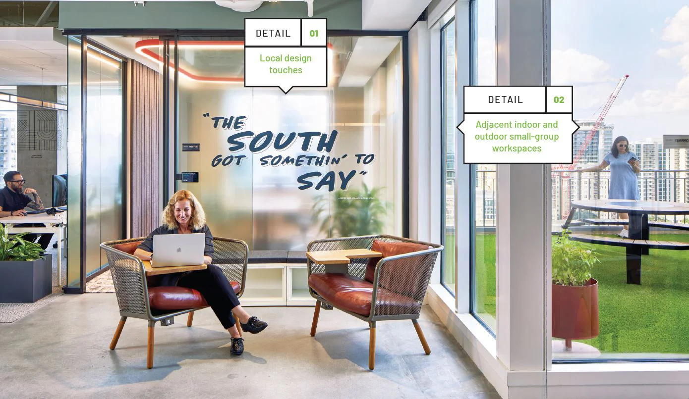 To infuse offices with a sense of here and now, designers add what they call “layers of locality,” often in the form of installations by local artists, or products—ranging from plants to foods to beverages—sourced from the surrounding region. In this office, arriving employees are greeted by a café that serves locally produced favorites, including coffee, beer, and other beverages (this is Coca-Cola country). The café is centrally located because “we wanted to figuratively bring our clients into our kitchen,” says the project’s lead designer, John Cantrell.
