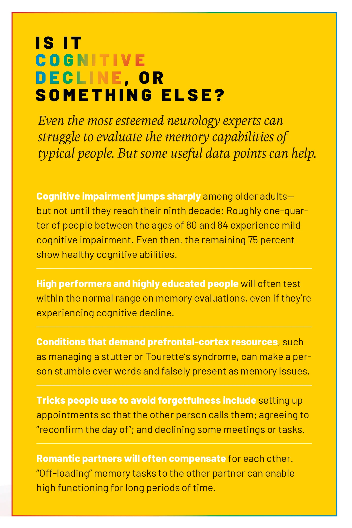There’s a reason that most people misunderstand the nature of cognitive decline: It’s confusing. Some people in their 60s and 70s appear totally sharp, but are actually compensating for significant defects; others might have frequent verbal gaffes, but are sharp as a tack. “Appearances don’t necessarily track with functioning,” says Charan Ranganath, author of Why We Remember: Unlocking Memory’s Power to Hold on to What Matters, and director of the Dynamic Memory Lab at the University of California, Davis, where he is a professor of psychology and neuroscience.