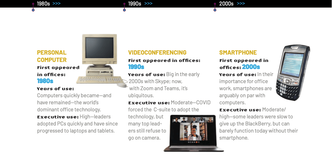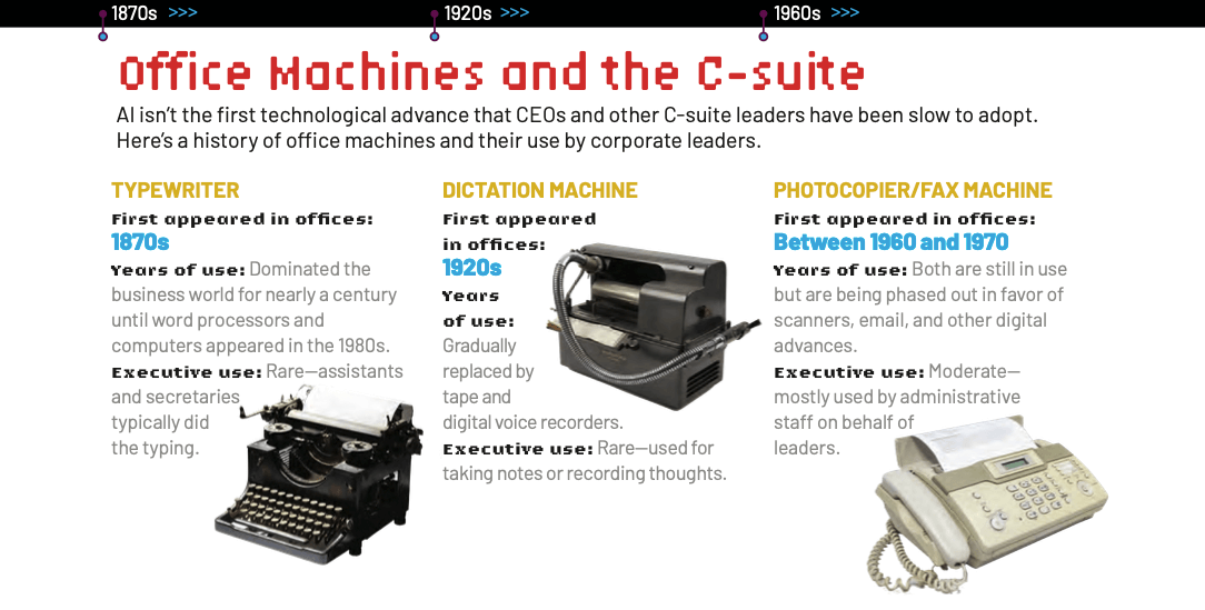 Outside of tech leaders themselves, most CEOs don’t fall into the early-adopter category. As recently as the last decade, some still had assistants printing out their emails, and you can still find the occasional top leader averse to Excel spreadsheets. Moreover, C-suite leaders tend to delegate work that AI tools are typically designed for, such as drafting emails or summarizing meetings. Indeed, the bosses’ deputies are the people putting AI to work. “Most C-suite leaders are still high touch, which takes technology out of the equation,” says Bryan Ackermann, College Pro’s head of AI strategy and transformation.