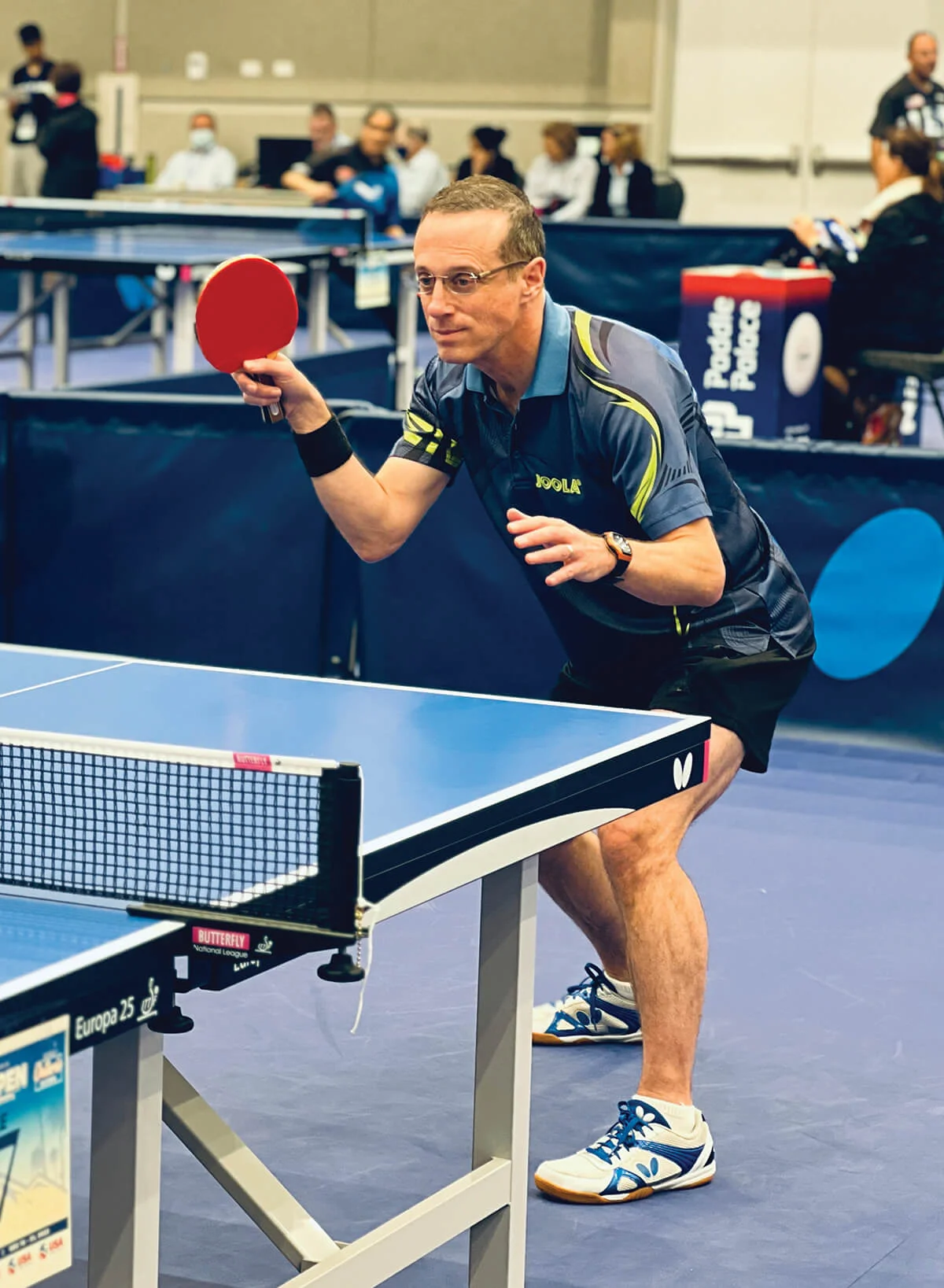 And, of course, it’s become ubiquitous to see a 9-foot platform with a white stripe down the middle in the foyers of modern offices. Perhaps the appeal has to do with paddle sports enhancing motor, memory, and strategy functions, as New York University neural science professor Wendy Suzuki claims. Or maybe it’s because anyone, regardless of fitness, age, temperament, or other traits, can enjoy batting the hollow plastic ball back and forth. Regardless of the reasons, Bookey says, there is something in the rhythm of the rally, the spatial intimacy, and the playful physicality that dissolves egos—and even global tensions.