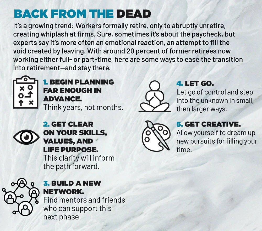 In a variety of forms, the story of the surgeon who could no longer perform surgery is a common one. It’s also the story of the executive who builds a successful career and keeps her head down—though the signs suggest it’s time to plan retirement—and plows forward as if all will go on forever. When the day does finally come to relinquish her post, she is unmoored. Or it’s the story of the CEO who refuses to pivot, the investor who doesn’t sell, or the burnout who can’t quit, all of them unable to let go and frozen by fear of what’s on the other side. A 2023 Employee Benefit Research Institute survey found that a third of workers plan to retire older than 70—or never. In reality, almost half are caught unprepared after being forced out of the workforce much earlier than expected.