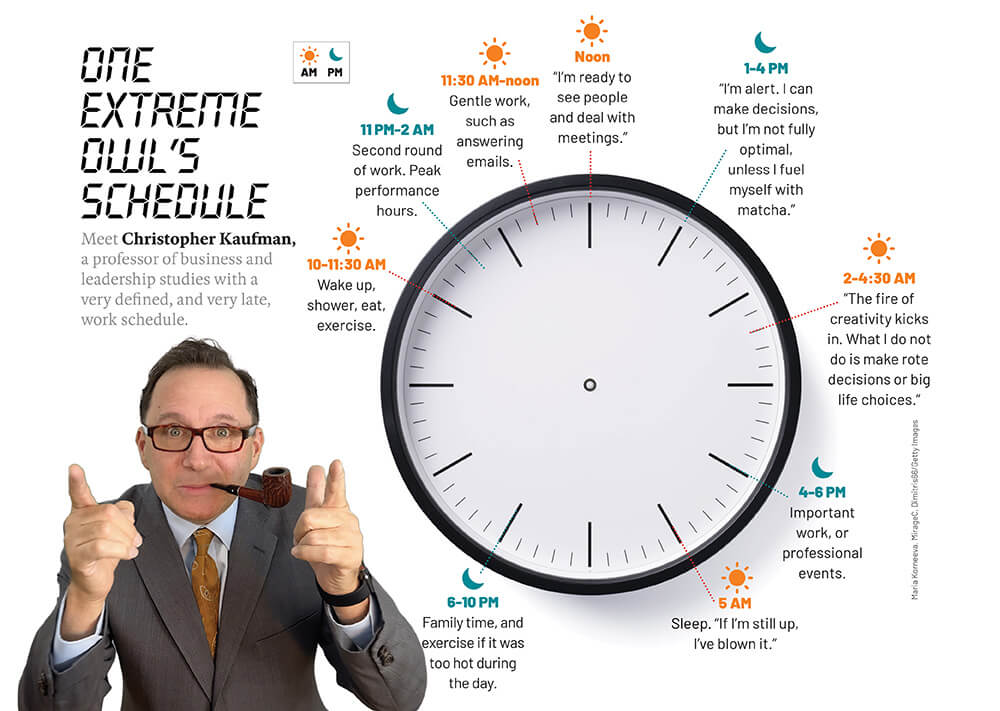 Tanase is among the roughly 15 percent of workers whose circadian rhythms, known as chronotypes, lead them to do their best work in the wee hours. Some are extreme early risers, sometimes called “larks,” who naturally wake up at 3 AM or even earlier, while others are still awake from the previous evening, not hitting the hay until 4 AM or 5 AM. These larks and owls speak rapturously about the calm of night, when there are no ringing phones or crying kids or pressing errands and they are able to do their best work. “At night everyone’s in bed and I can come alive,” says London Wolfe, a business alignment strategist.